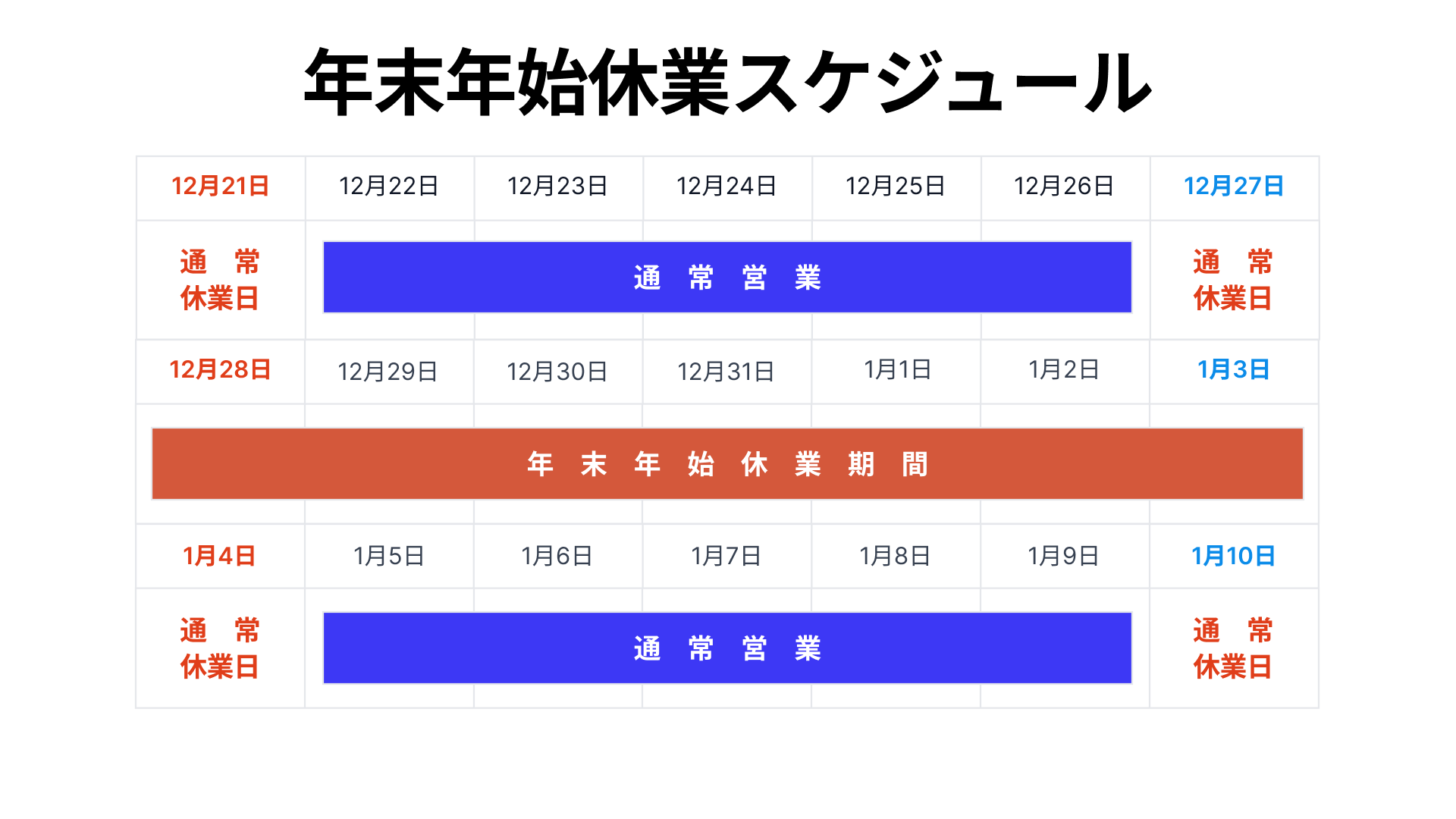 弊社では、誠に勝手ながら下記の期間を年末年始休業とさせていただきます。